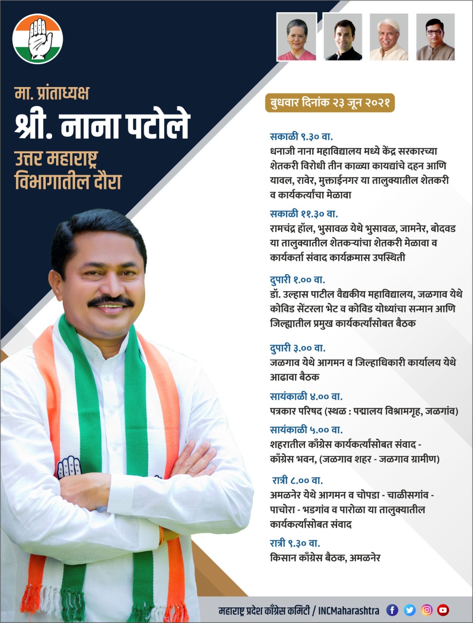 اطلاع کے مطابق کانگریس کے پہلے دیہی اجلاس منعقد ہونے کے شہر فیض پور ضلع جلگاؤں سے ناناپٹولے اس دورے کی شروعات کریں گے جہاں وہ مرکزی حکومت کے تینوں رزعی قوانین کی کاپیاں نذرِ آتش کریں گے۔ اس کے بعد وہ کسانوں وپارٹی کے کارکنان سے خطاب کریں گے۔ اس دورے میں ناناپٹولے اس علاقے کے کووڈ سینٹر وکوووڈ اسپتالوں میں بھی جاکر ملاقات کریں گے جبکہ کانگریس پارٹی کے ذریعے شروع امدادی کاموں کا جائزہ بھی لیں گے اور مختلف جگہوں پر کانگریس کے عہدیداران وکارکنان سے ملاقات کرتے ہوئے تنظیمی سرگرمیوں کا بھی جائزہ لیں گے۔ ریاستی صدر کے ساتھ اس دورے میں ریاستی کارگزار صدر ایم ایل اے پرینیتی شندے، کارگزار صدر ایم ایل اے کنال پاٹل، ریاستی ترجمان اتل لونڈھے، کسان کانگریس کے قومی نائب صدر شیام پانڈے بھی موجود رہیں گے۔ پٹولے کا یہ دورہ چار دن کا ہوگا جو آج جلگاؤں ضلع سے شروع ہوکر 26 جون کو ناسک میں اختتام پذیر ہوگا۔